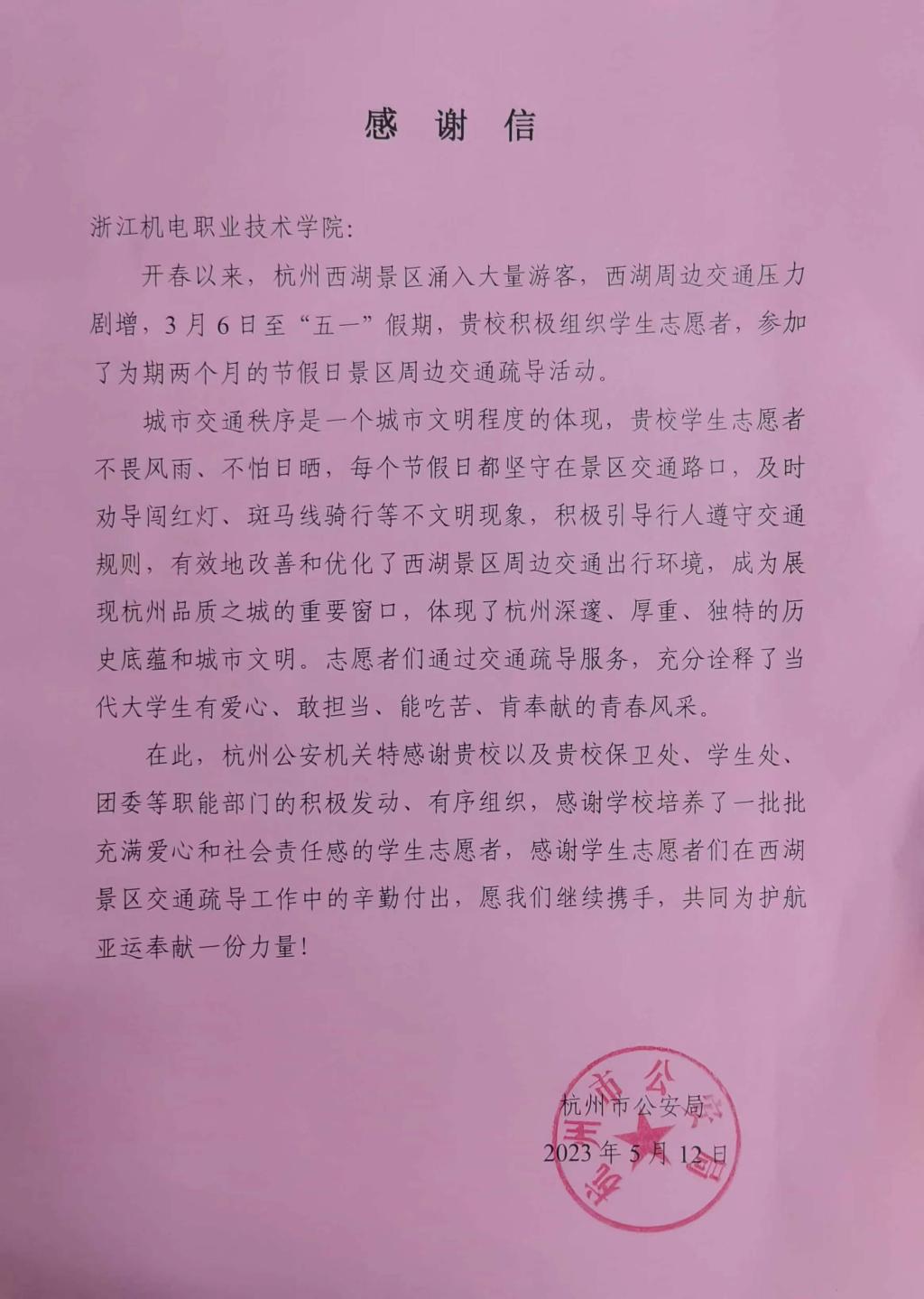 今年3月6日至5月3日节假日期间,在校团委、各二级分院等相关部门的积极配合下,保卫处和校团委共同启动志愿者招募工作,组建了一支80人的志愿者队伍,活动期间每个周末这些志愿者风雨无阻协助交警开展志愿工作。最终圆满完成景区高峰期交通疏导任务,彰显了新时代机电学子志愿服务风采和担当。