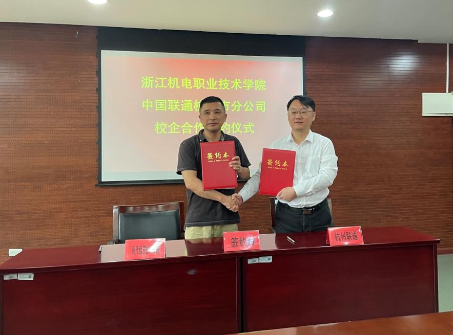 签约仪式上,浙江机电职业技术学院现代信息技术学院与中国联通杭州市分公司共同签订《校企合作协议》。根据协议,双方本着“互惠互利”的原则,将在产学研合作、技术服务、专业建设、课程开发、顶岗实习、学生就业、学生社会实践、学生创新创业孵化(学生竞赛)等项目上开展全面合作,打造产教深度融合的技术技能人才生态圈,主动服务浙江经济社会发展。