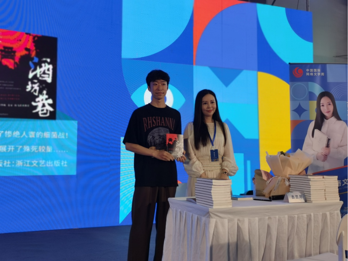 签售会上,多位知名文学作家携最新著作现场签售,为现场读者进行作品创作背景及作品梗概介绍,读者们纷纷驻足倾听,不时提问交流,沉醉在这场文化盛宴中。众多签售作品中,青年女作家古兰月带来的《酒坊巷》,尤其吸引读者。《酒坊巷》以金华抗战为背景,讲述了金华人民为取得抗战胜利做出的巨大牺牲和伟大贡献。1942年5月,侵华日军发动“浙赣战役”,金华沦陷。为彻底消灭抗日有生力量,日军在金华等地实施了惨绝人寰的细菌战。地下党员唐振华与恋人金九妹不辞而别多年后,肩负特殊使命潜回金华酒坊巷,秘密寻找一批治疗鼠疫的“血清针”。克服重重困难,成功将“血清针”运往浙东抗日根据地,挽救了大批抗日将士和群众的生命。
