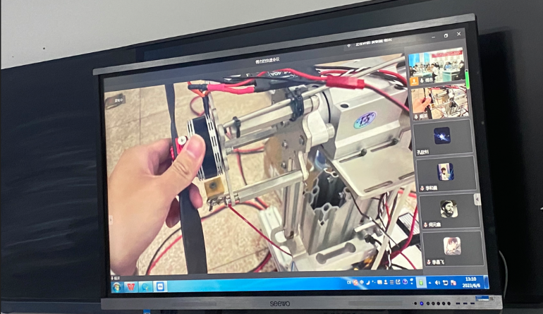 2023年6月6日中午,空中课堂在智能机器人实训室拉开帷幕。通过企业微信平台,俞金妹老师指导的我院电子2101班与傅杰老师指导的阿克苏职业技术学院机械21401班进入了同一个课堂。