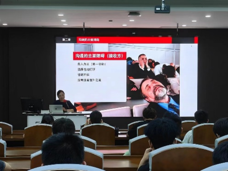 黄雪主要从“沟通的重要性”、“沟通的主要障碍”、“如何与上级沟通”、“工作中的礼仪”四个角度,通过案例教学的形式,与同学们讲述了职场中沟通与礼仪的重要性。