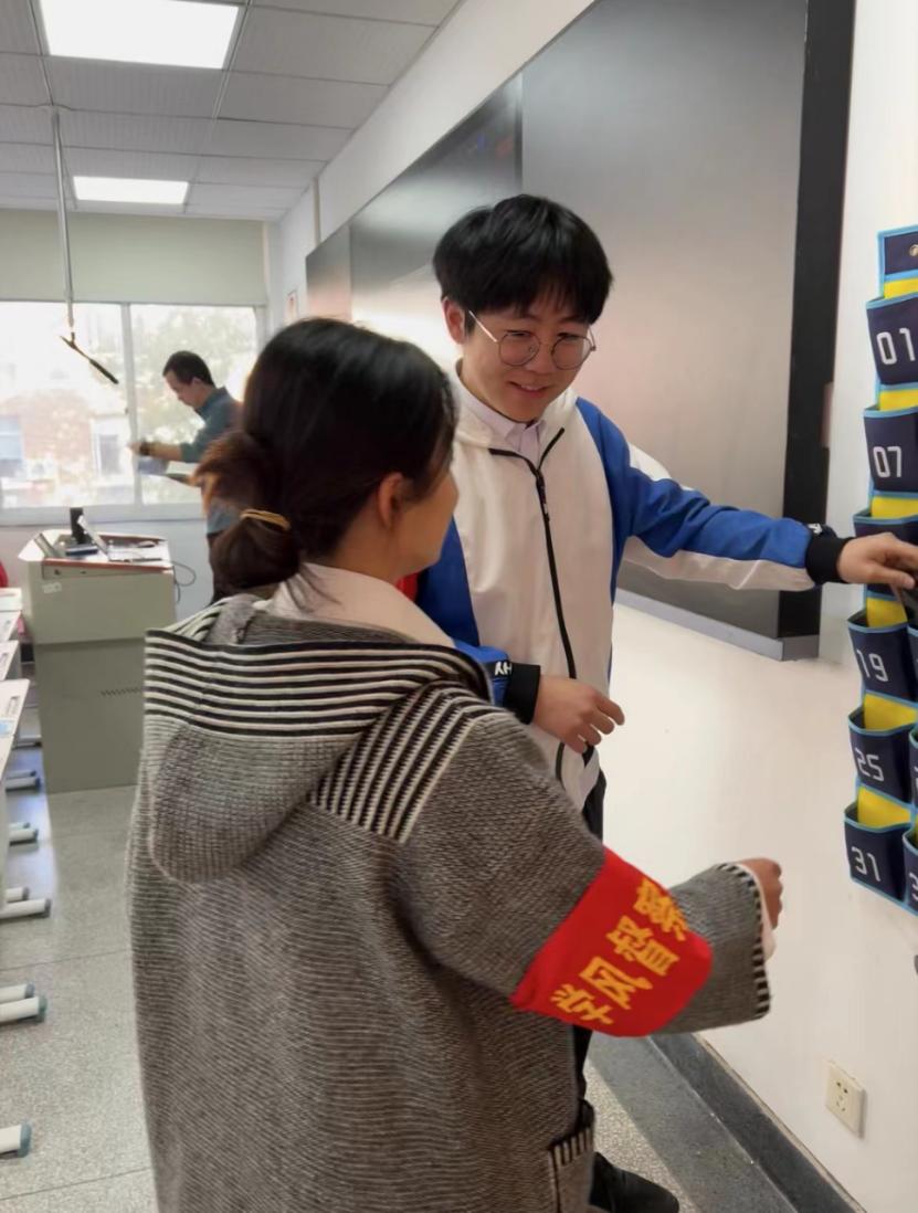 自动化学院志愿者们在教学楼下站岗执勤,他们身体力行,坚持早起,像挺拔的松树一般站在门口提醒同学们不迟到不早退,正确佩戴口罩,不带三餐进教学楼。在巡查过程中,志愿者们提醒同学们手机入袋,保持良好的精神状态迎接每一节课。不仅维护了教学楼学习环境的干净整洁,营造了和谐有序的教学环境,更进一步推动了文明校园的创建。