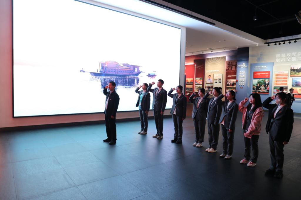 纪念馆内,讲解员带领大家先后参观了“救亡图存”、“开天辟地”、“光辉历程”、“走向复兴”等展厅,大家认真观看每一件历史展品,仔细倾听工作人员讲解,不时驻足细观书籍、照片、遗物等珍贵史料。一幅幅珍贵的历史照片、一段段详细的文字介绍,生动地再现了1921年的那段往事,当年正是在南湖的一艘船上,中共一大通过了党的第一个纲领和第一个决议,选举产生了中央领导机构,宣告了中国共产党的诞生。沿着中国共产党百年光辉历程,我们真切感受到革命先辈追求理想、前赴后继、不畏牺牲的奋斗初心与革命精神。我们也看到了新中国成立以来,祖国从站起来、富起来到强起来翻天覆地的变化,也共同展望中华民族伟大复兴的光明前景。参观过程中程书记结合馆内主题展板为在场成员生动阐述了“红船精神”的丰富内涵,这种“沉浸式”学习让大家对“红船精神”有了更深刻的感悟。最后,程书记带领学生预备党员重温入党誓词,铿锵有力的誓词,让大家深刻体会到作为一名新时代党员所肩负的使命和责任。
