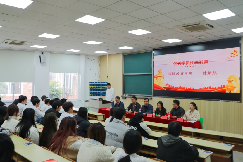 随后,本期业余党校优秀学员代表国贸2281班付紫航同学做了发言。付紫航同学倡议学员们坚持和发扬党的优良作风,积极工作,遵守党的纪律,力争成为新时代社会主义核心价值观的践行者和实现中华民族伟大复兴的接班人。