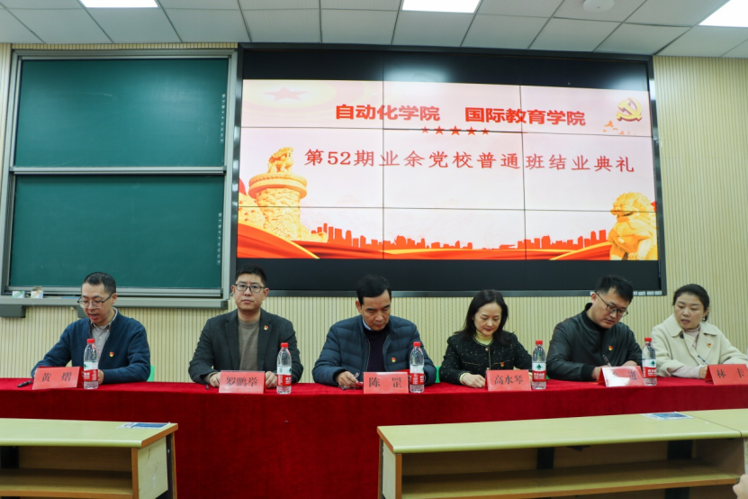 11月30日中午,自动化学院、国际教育学院联合举办的第52期业余党校普通班在滨江校区四扇、海宁校区10号楼101室迎来了结业典礼。自动化学院党总支书记陈罡、国际教育学院党总支书记高水琴、自动化学院党总支副书记罗鹏举、国际教育学院党总支委员黄熠、自动化学院学工办主任孟进、自动化学院应用电子学生党支部书记林卡以及自动化学院、国际教育学院全体业余党校学员参加了此次典礼。本次典礼由国际教育学院党总支委员黄熠老师主持。
