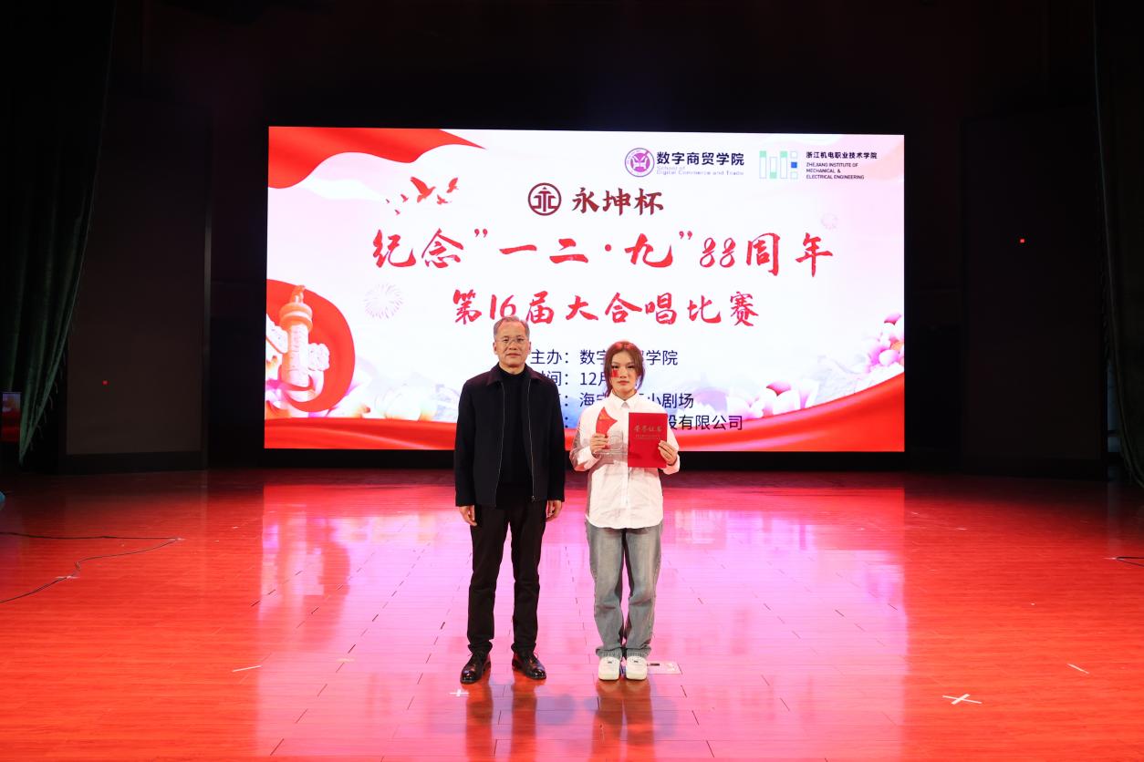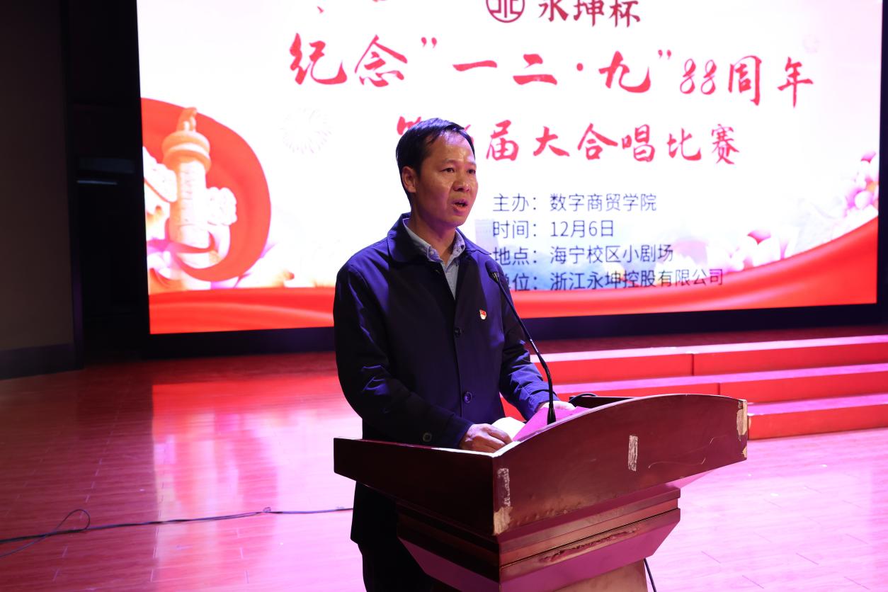 1935年12月9日,数千北平学生在中国共产党的领导和号召下举行了一场抗日救亡爱国运动,极大促进了中国人民的觉醒。88年前,青年学生振臂一挥,奏响爱国主义的乐章;88年后,“天下兴亡、匹夫有责”的爱国主义情怀依旧在青年学生中闪耀光芒。为弘扬“一二·九”运动自强不息、追求真理、勇于实践的民族精神,数字商贸学院12月6日晚在海宁校区小剧场举办纪念“一二•九”运动88周年暨“永坤杯”第十六届大合唱比赛。学校党委副书记周增逵、学校相关职能部门负责人、学院的党政领导班子、全体辅导员和23级班主任共同出席,比赛评委邀请到校学工部、学生处副处长方惠玲,海宁校区综合办副主任谢雯,公共基础部艺术教研室主任李霞和公共基础部黄轶璠老师。