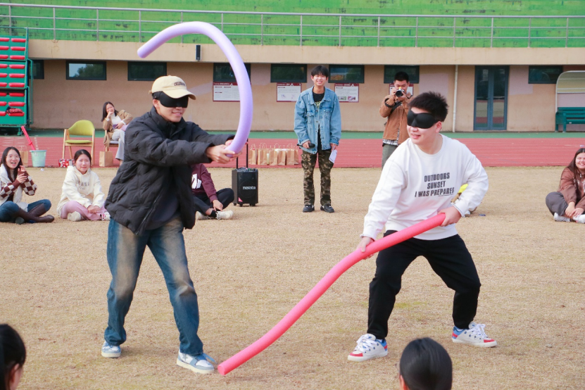 在双方队员就位后,戴上眼罩,将两人距离拉开,中间距离三米左右。游戏开始后,双方原地转圈(5-10圈)后开战。最先打到对方的获胜(只能自上而下打,不许横扫)每场对决赢的人有零食奖励,输的接受处罚。