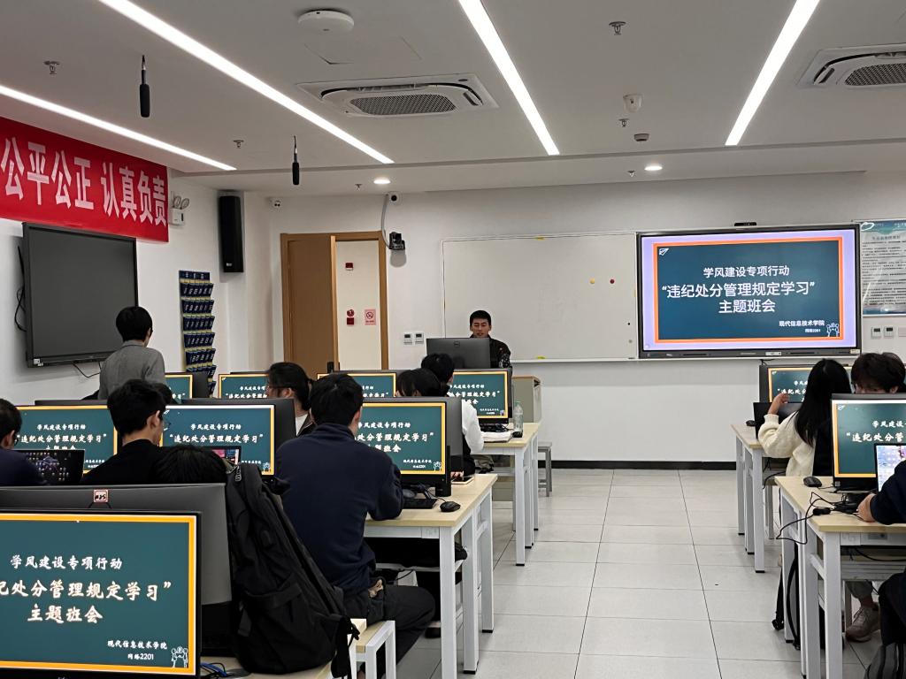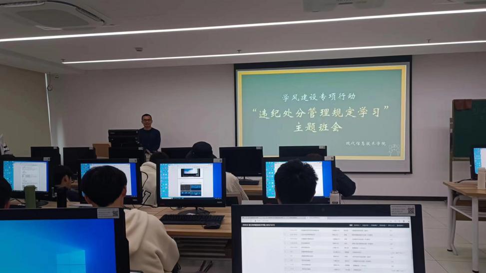 为进一步教育和引导学生们树立明确的学习、生活目标,增强遵守各项校纪校规的自觉性,为今后的学习生活打下良好的基础,让学生们对学校的规章制度有全面的了解和深刻的认识,提高学生自我管理、自我学习的能力。12月18日至22日,现代信息技术学院组织开展了“违纪处分管理规定学习”主题班会。