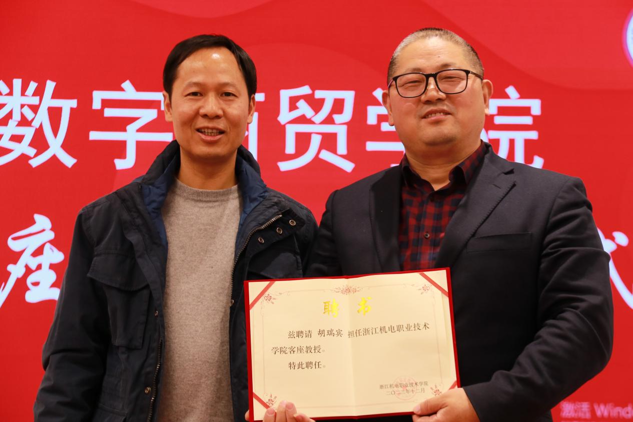 最后,举行浙江机电职业技术学院“胡瑞宾客座教授聘任仪式”,并由程勤华书记代表学院为胡瑞宾先生颁发客座教授聘书。程书记对胡瑞宾学长受聘学院客座教授表示欢迎和感谢,他表示作为多家企业的总经理和董事长,能如此关心关注职业教育,重视创新创业工作是非常难能可贵的,希望日后能把校友企业建设成联系紧密的校企合作关系,期待胡教授能常回母校指导学弟学妹开展创新创业活动,充分发挥客座教授功能和价值,尤其是胡教授作为省内创新创业专业评委,也希望接下来能助力学院挑战杯和互联网+等创新创业类大赛,争取更大突破。