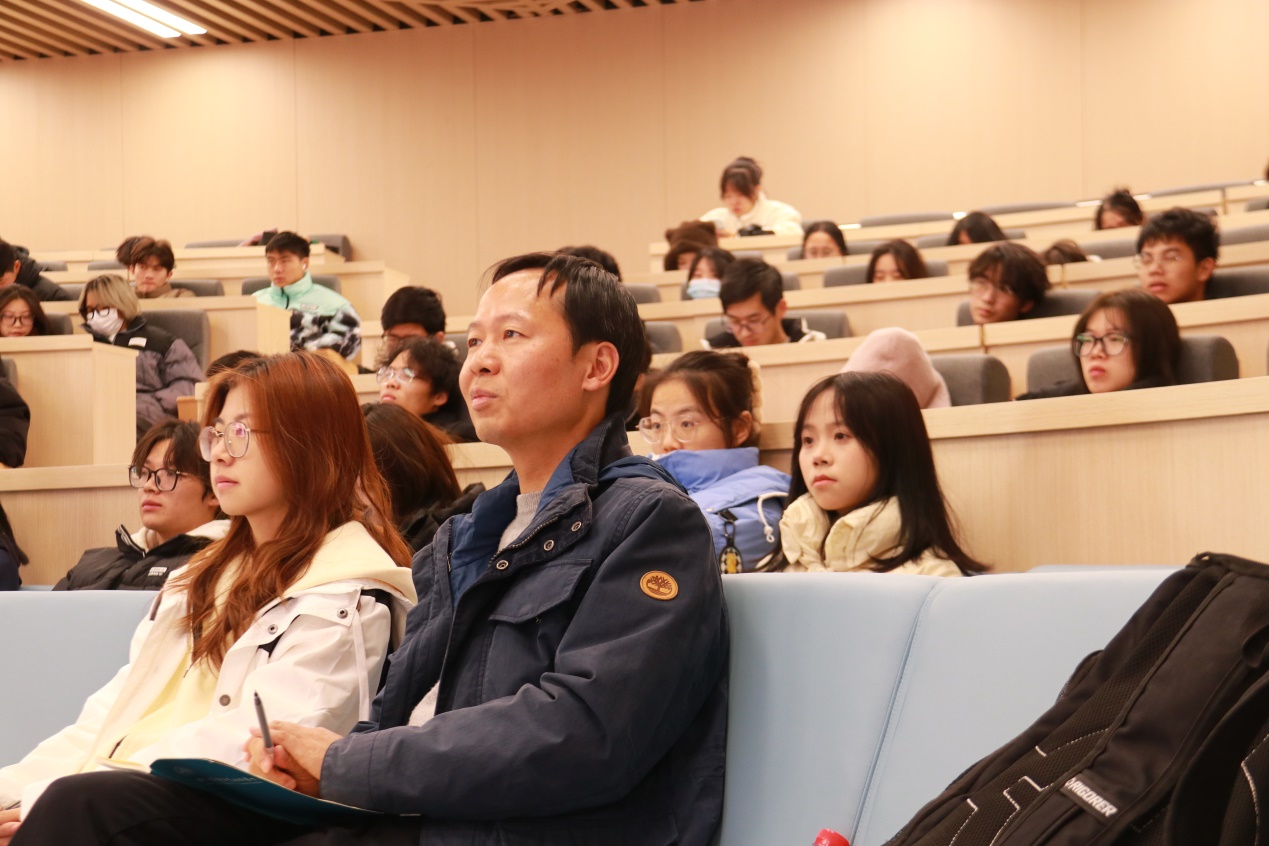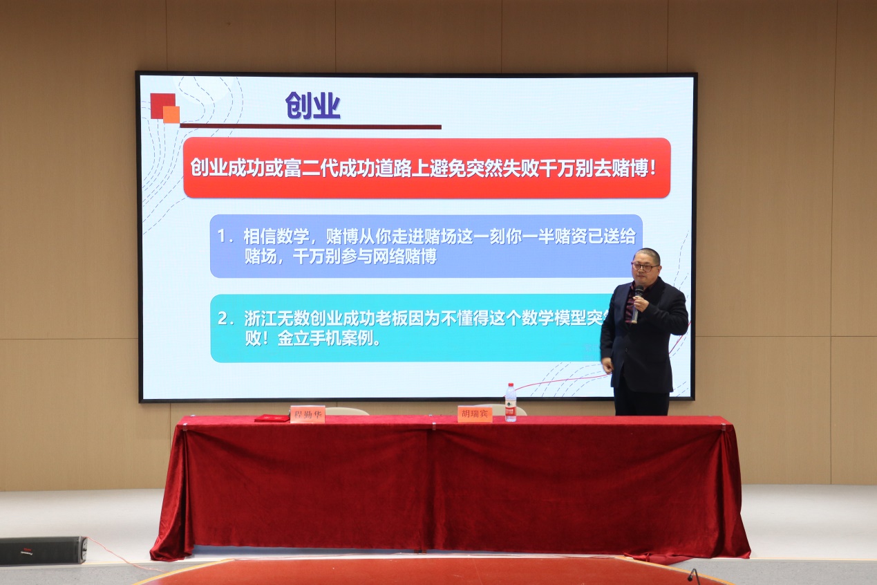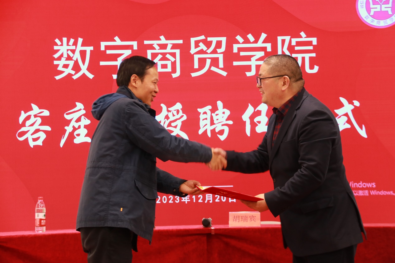 2023年12月20日下午,由数字商贸学院举办的“零距离论坛”之大学生创新创业专题报告会暨客座教授聘任仪式在海宁校区19号楼一楼报告厅举行。本次报告会有幸邀请到校1992届优秀校友、万旭来建设科技有限公司董事长总经理胡瑞宾先生与学弟学妹分享了自己的创业经历与创业心得,学院总支书记程勤华出席并主持,70余名来自学院不同专业热衷于创新创业的同学们参与了本次报告会。