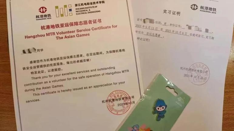 杭港地铁亚运保障志愿者证书及纪念品