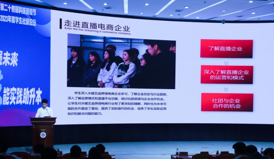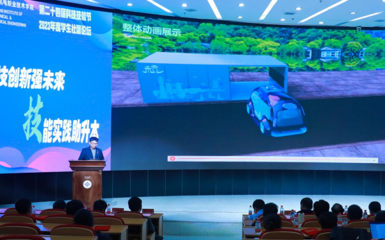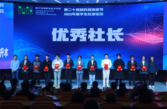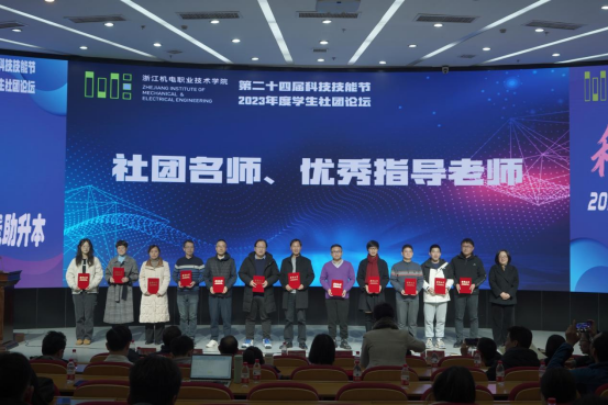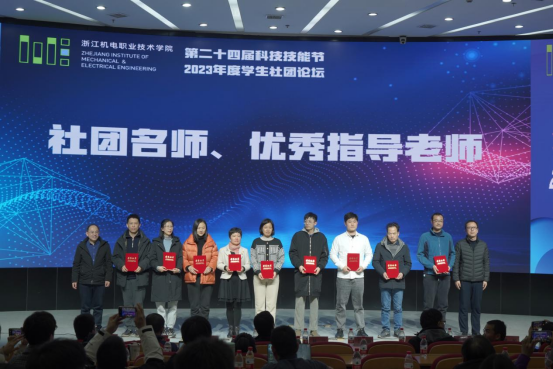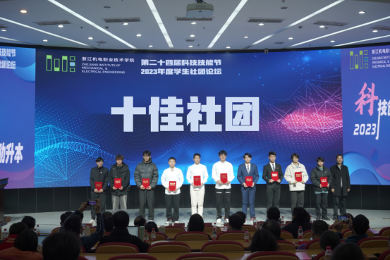 同时,2023年度学生社团论坛作为本次科技技能作品展的配套活动也于当天下午在综合楼四楼学术报告厅顺利落下帷幕。论坛表彰2023年度特色社团项目、优秀社团、十佳社团3项集体荣誉;2023年度社团名师、优秀指导教师、优秀社长3项个人荣誉。8个特色学生社团围绕社团建设与管理、社团项目培育思路与特色等方面展开交流。来自智慧交通学院的汽车营销协会以《展青春活力育汽车英才》为主题,展示了社团通过举办创新活动、技能竞赛、考证、系列讲座为载体构建社团一二课堂相结合的育人模式;来自国际教育学院的跨境电商三创双循环社团以《服务本土企业的跨境电商直播三创实践探索》为主题,阐述了社团的特色项目建设思路、社团活动开展的有效路径;此外,智能制造学院的智能制造科技创新社团、自动化学院的智能机器人协会、现代信息技术学院的Scratch研学社、数字商贸学院的山丘传媒社、创意设计学院的草木染社团和3D刻印俱乐部等社团也进行了展现,为社团建设带来了诸多有益经验。