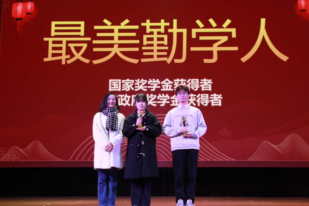 “最美勤学人”是为一年来获得国家和省级奖学金同学设置的奖项,学校学工部部长王汇、创意设计学院副院长季海祺、办公室主任刘博盛为这些获奖同学进行了荣誉颁授。