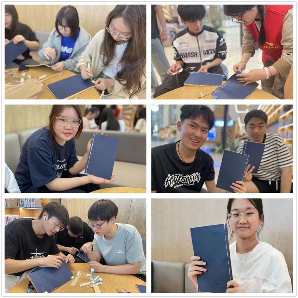 同学们听得津津有味,纷纷动手尝试,虽为理工科学生,在穿针引线、谋篇布局上却显得游刃有余,展现出了他们特有的严谨和耐心。同学们充分发挥了团队合作精神,互相学习、互相帮助,共同完成了各自的古籍线装作品。
