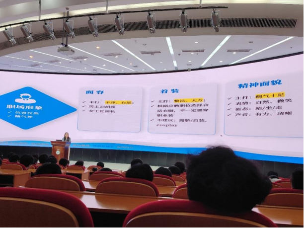 王佳燕向同学们详细地讲解了目前的就业形势,针对目前大学生就业形势做了具体分析;她着重为同学们讲解了简历制作、面试技巧、职业规划、职场适应等一系列在求职过程中会遇到的问题以及应对方法;她还强调要明确职业目标、择业原则和方法、就业程序,并鼓励同学们调整好心态,积极就业。