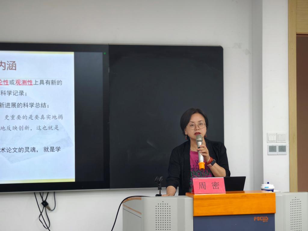 周编辑认为,学术论文的灵魂是具有创新性和学术价值。这就意味着,论文的选题要有独创性特色,结合国际前沿或聚焦热点、难点,将应用研究价值加强,彰显研究价值。同时周编辑强调,选题不可功利性太强,避免过大、太空、太旧。周编辑也从自身的审稿经验出发,介绍了编辑部的审稿流程,提醒投稿人们审核时的着重点以及一些注意事项,让在座的老师们受益匪浅。