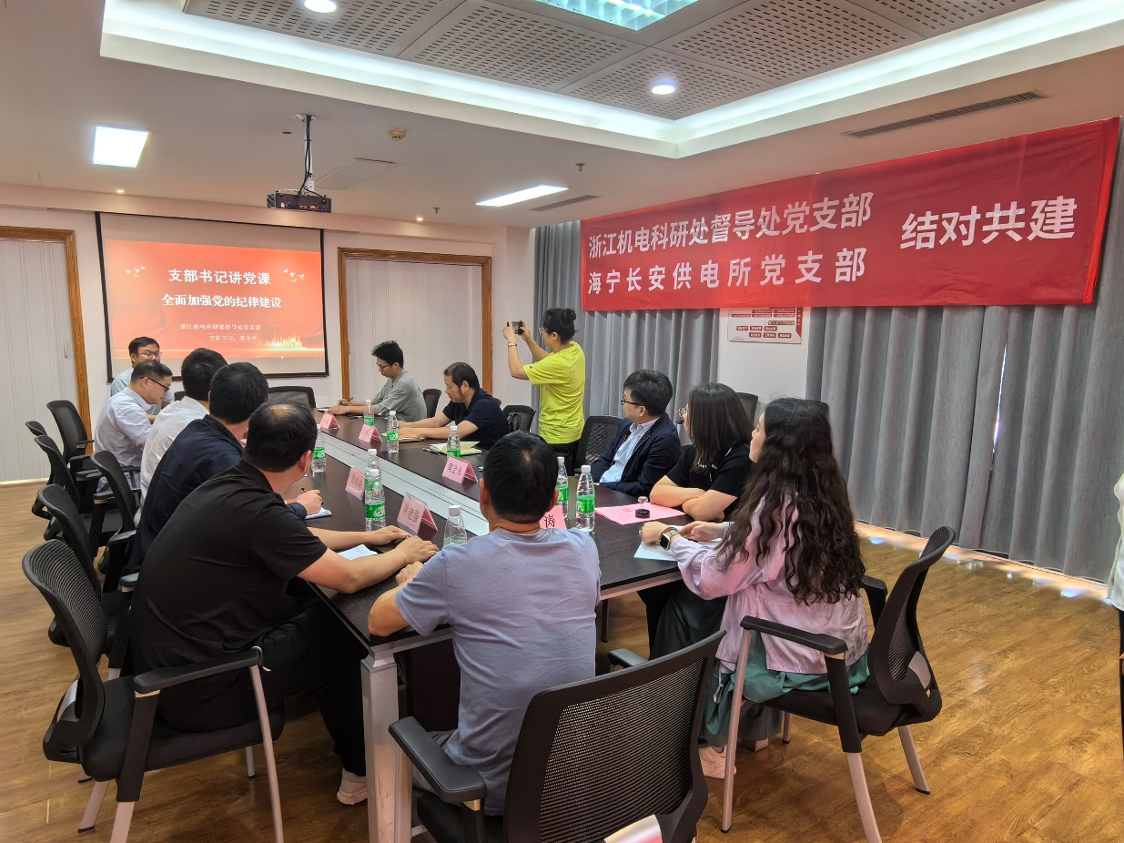 为深入贯彻落实党的二十大精神,进一步增强党建共建活力,推动基层党建联合创新机制、新模式的融合发展,2024年5月24日,在国网海宁市供电公司长安供电所,科研处督导处党支部与海宁长安供电所党支部举行了党支部互联共建签约仪式。浙江机电职业技术学院督导处处长、科研处督导处党支部书记高永祥,高教所所长马林才,科研处副处长黄金永,长安供电所党支部书记张娟霞,长安供电所所长何一帆及双方支部党员参加了仪式。