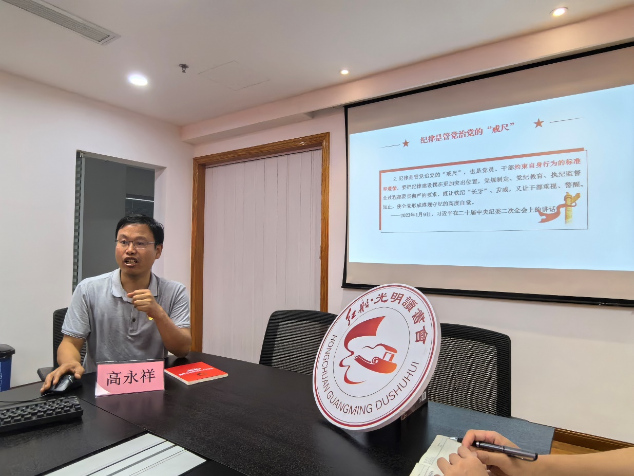签约仪式后,双方就支部建设、专业建设、人才培养等方面进行了座谈交流,围绕如何共促组织建设、共用党建载体、共助结对互帮、共建沟通机制等议题进行了深入探讨。高书记介绍了学校成立以来在党建方面取得的成果,希望双方能够以此为契机,聚焦支部建设中的痛点问题,实现优势互补,加强党员之间的交流与互动,共同推动党建工作迈上新台阶。会上,高书记带领大家深入解读了《党章》和新修订《中国共产党纪律处分条例》的重要内容和精神实质,使各位党员同志们更加清晰地认识到提高政治站位、增强纪律意识的重要性。