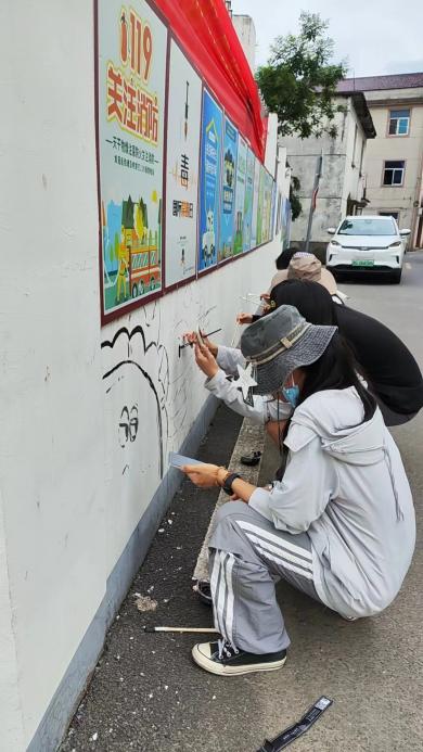 实践队充分发挥专业特长,以古渊头村的文化元素为灵感,将一幅幅充满创意和活力的墙绘作品描画在九曲巷、幼儿园等地墙面。滚烫的汗珠从额头划过,汗水浸湿了衣裳,队员们不怕苦不怕累,顶着烈日墙绘,充分展示了创设学子的良好精神风貌。