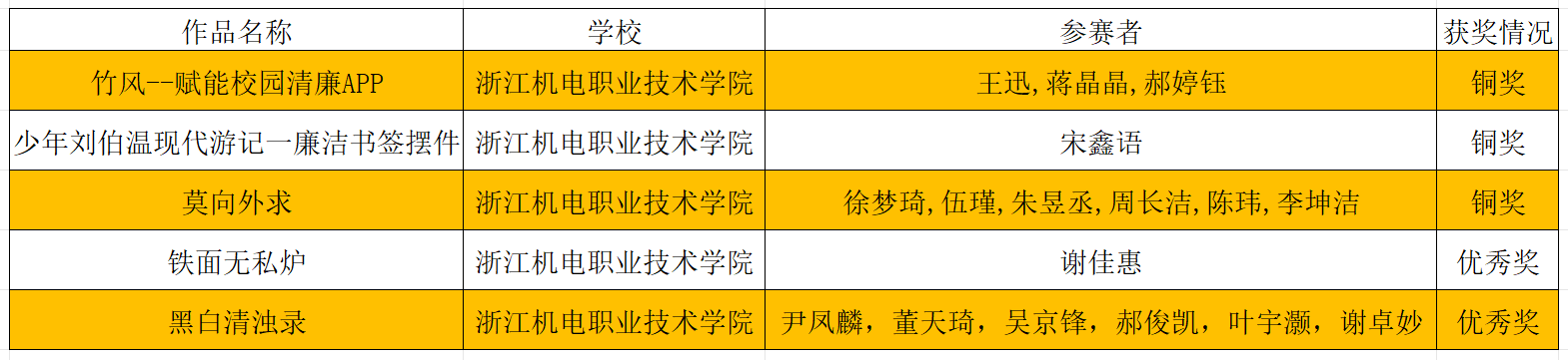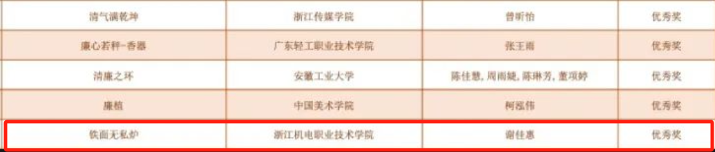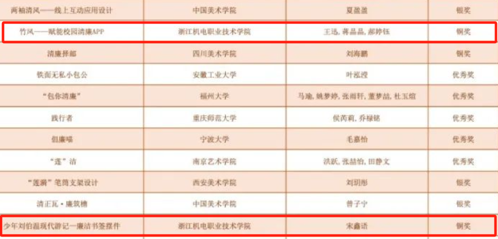 创意设计学院报送的三项作品《竹风——赋能校园清廉APP》《少年刘伯温现代游记——清廉书签摆件》《莫向外求》获得铜奖,另有《铁面无私炉》《黑白清浊录》两项作品获得优秀奖,成绩傲居全国高职院校第一。