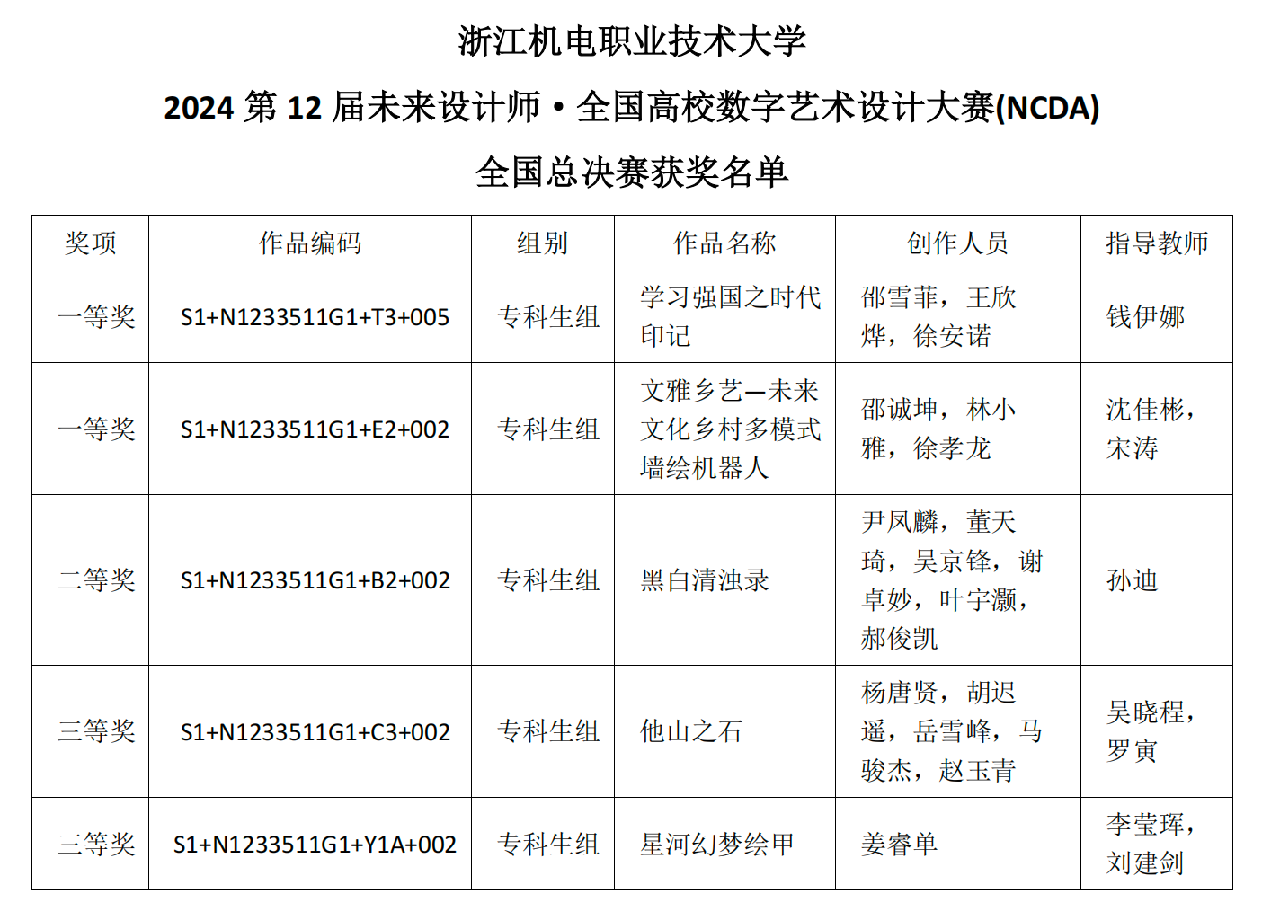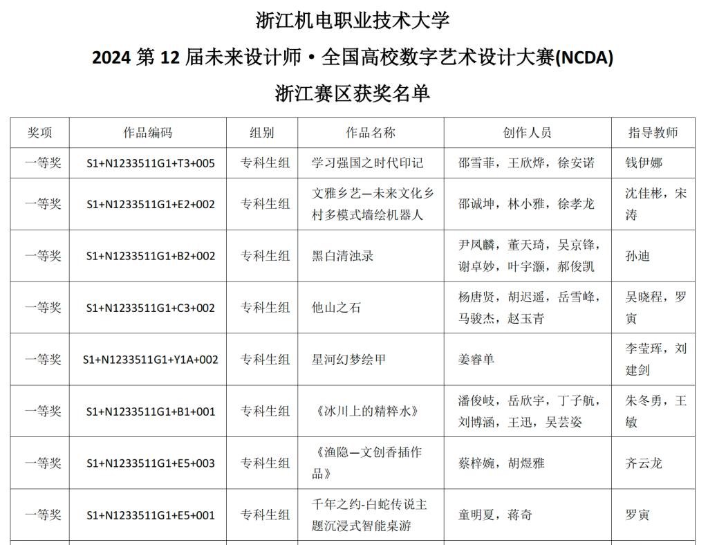 近日,2024第12届未来设计师NCDA大赛省赛和国赛获奖作品依次公示,经校级赛-资格赛-省级初赛-省级决赛-全国总决赛多轮竞赛,浙江机电职业技术大学创意设计学院师生创作的作品《学习强国之时代印记》和《文雅乡艺-未来文化乡村多模式墙绘机器人》获得国赛一等奖,《黑白清浊录》《他山之石》《星河幻梦绘甲》《冰川上的精粹水》《渔隐-文创香插作品》《千年之约-白蛇传说主题沉浸式智能桌游》6件作品获得省赛一等奖,另外其余作品获得国赛二等奖1项、三等奖2项、省赛二等奖7项、三等奖7项。