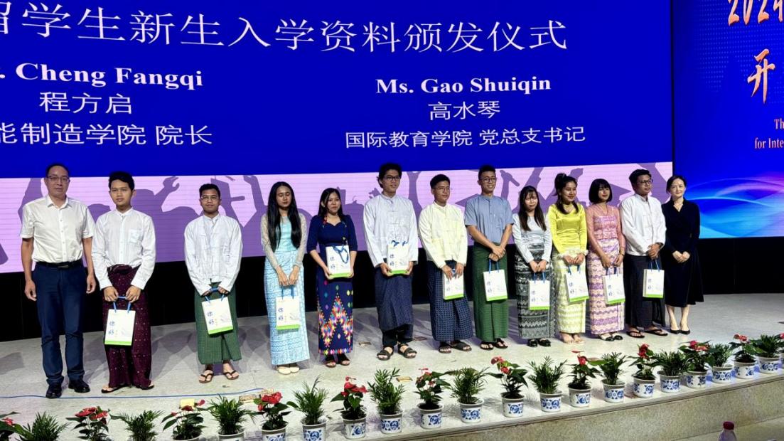 在一片掌声中,教务处处长刘哲纬、学生处处长王汇、智能制造学院院长程方启、国际教育学院党总支书记高水琴等领导为留学生们颁发了新生入学礼包。