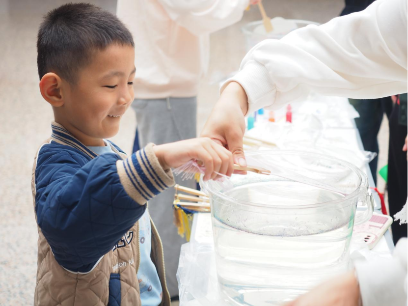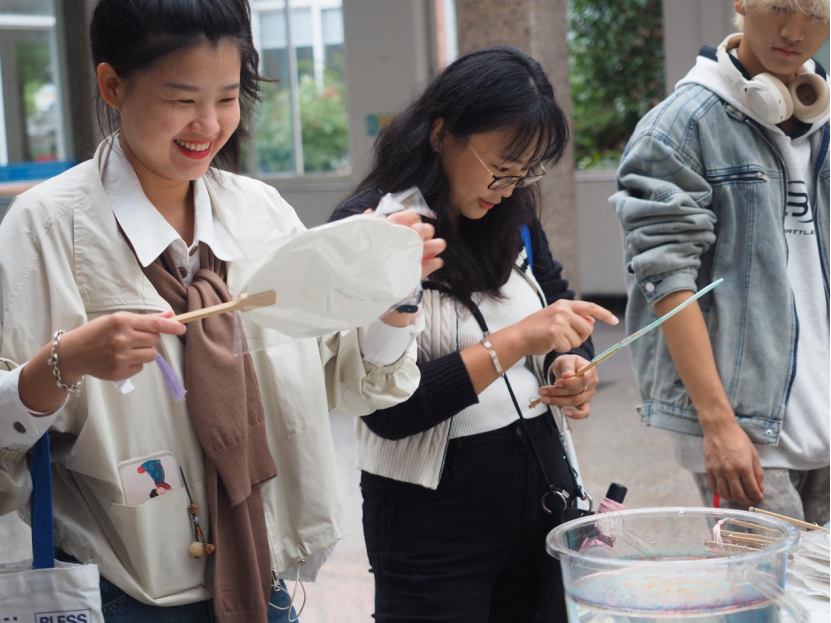学院为校友子女精心准备了一场亲子艺术趴活动,由校友携其子女共同创作、体验非遗漆扇制作,感受艺术的魅力。现场气氛活跃,在漆扇制作过程中,孩子们通过调漆、试色,以旋转或轻摇等不同方式和幅度DIY出自己心仪的色彩图案,切身感受到传统文化的魅力和色彩的奥秘与绚烂。