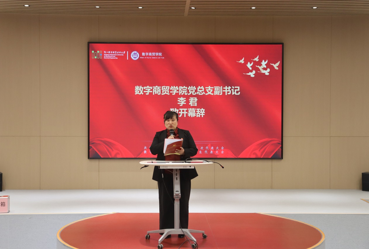 大会在庄严的国歌声中正式拉开帷幕。数字商贸学院党总支副书记李君致开幕词。她首先代表学院全体领导班子,向一直以来关心和支持我院共青团事业的各级业务主管部门表达崇高敬意与诚挚感谢,并以大会名义,向第十八届团总支学生会委员、广大团员和青年学子致以亲切问候与诚挚的祝愿。李君指出,学院团总支学生会始终秉持“求实、求精、求新”的校训,坚守以生为本、积极进取的工作理念,团结广大青年学子,在组织建设、思想引领、校园文化、社会实践、社团建设、服务学生、平安校园等多个方面奠定了坚实基础,在提高学生综合素质、繁荣校园文化、促进学风建设等方面发挥了关键作用,为学校高水平职业技术大学的发展添上了浓墨重彩的一笔。