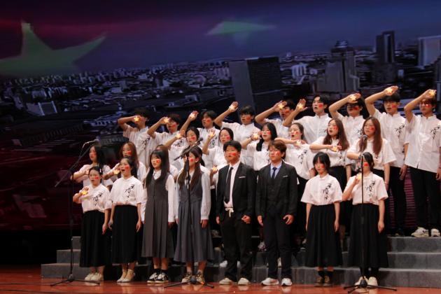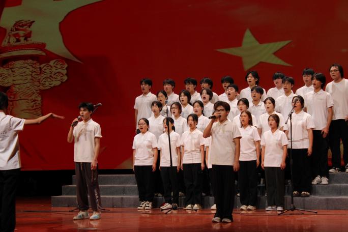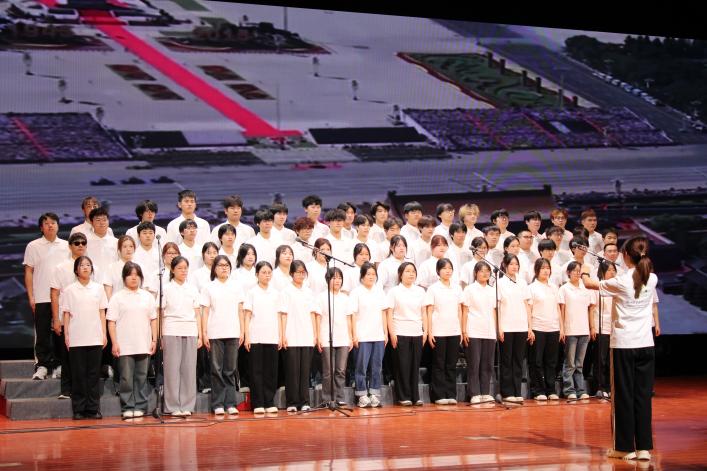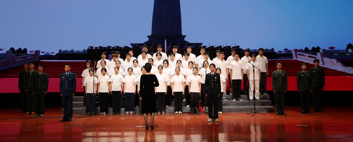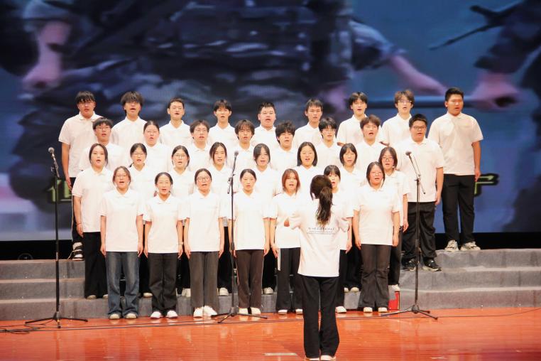 他们身着军装,歌声犹如出征的战鼓目出了古往今来英雄们对家国的忠诚与担当。同学们目光坚定,身姿挺拔,那磅礴的气势仿佛要冲破时空的界限,与历史上的爱国志士并肩作战。