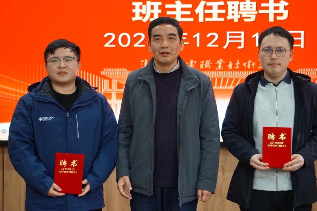 自动化学院党总支书记陈罡为海天现场工程师项目班班主任罗辰、潘庭超颁发聘书