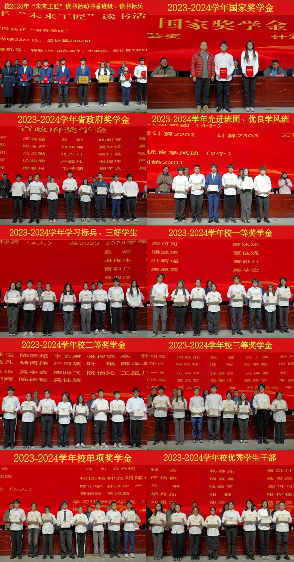 表彰大会上,图书馆馆长周秀梅老师亲至现场,为现代信息技术学院颁发“书香学院”荣誉,并授予物联2361班、云计算2302班“书香班级”、6名同学“读书标兵”称号。学院领导班子全体成员宣读表彰名单并为获国奖、省奖、校级奖学金、校级荣誉称号等学生代表和获奖集体代表颁发了荣誉证书。学工办主任毋琦作学院2024年学风建设专项行动总结。