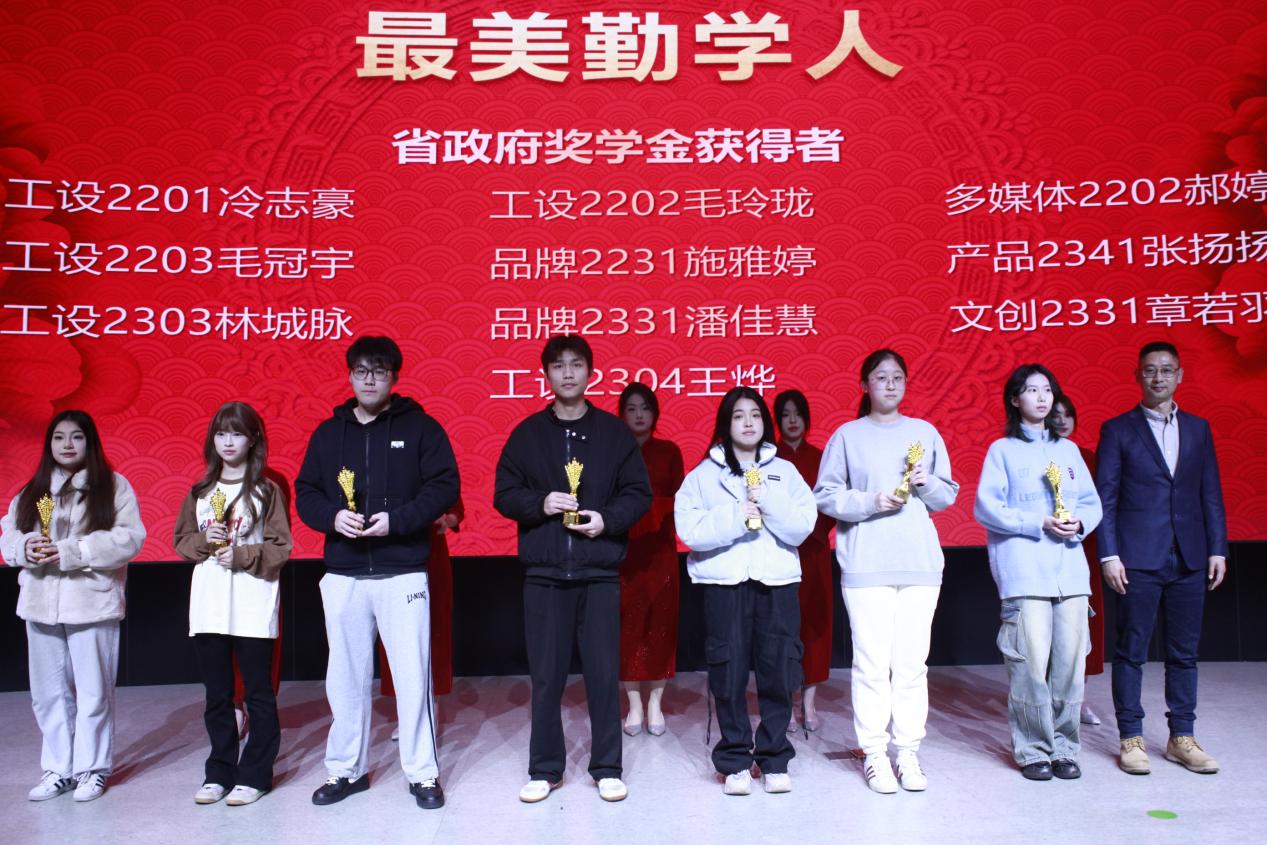 在“最美集体”颁授环节,创意设计学院为在先进班团、特优学风班,军训内务、队列优秀班优秀寝室进行了荣誉颁授。国家奖学金获得者和省政府奖学金获得者荣获“最美勤学人”称号。