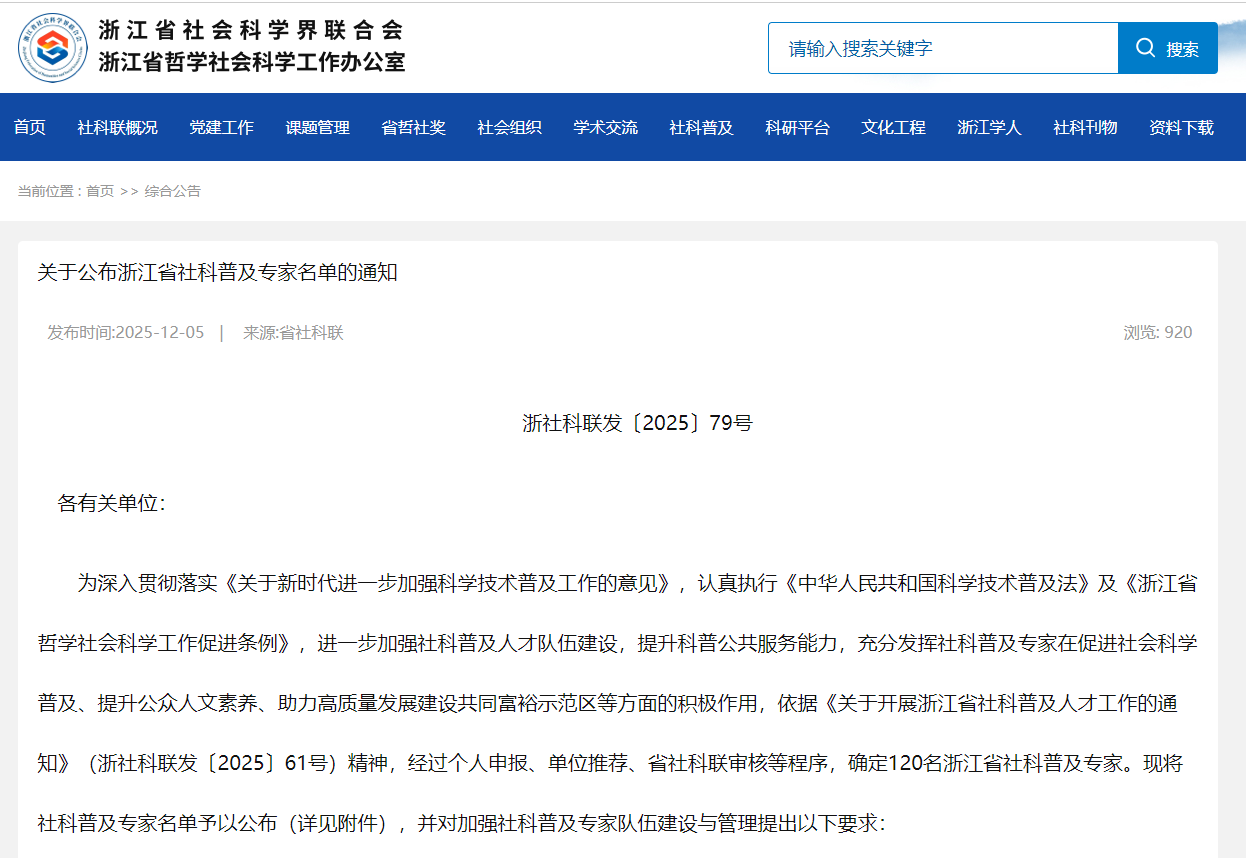近日,浙江省社会科学界联合会公布2025年浙江省社科普及专家名单,学校体育艺术部杜万新、公共基础教学部李慧芳、创意设计学院朱冬勇三位教师成功入选,成为全省120名社科普及专家中的重要一员。