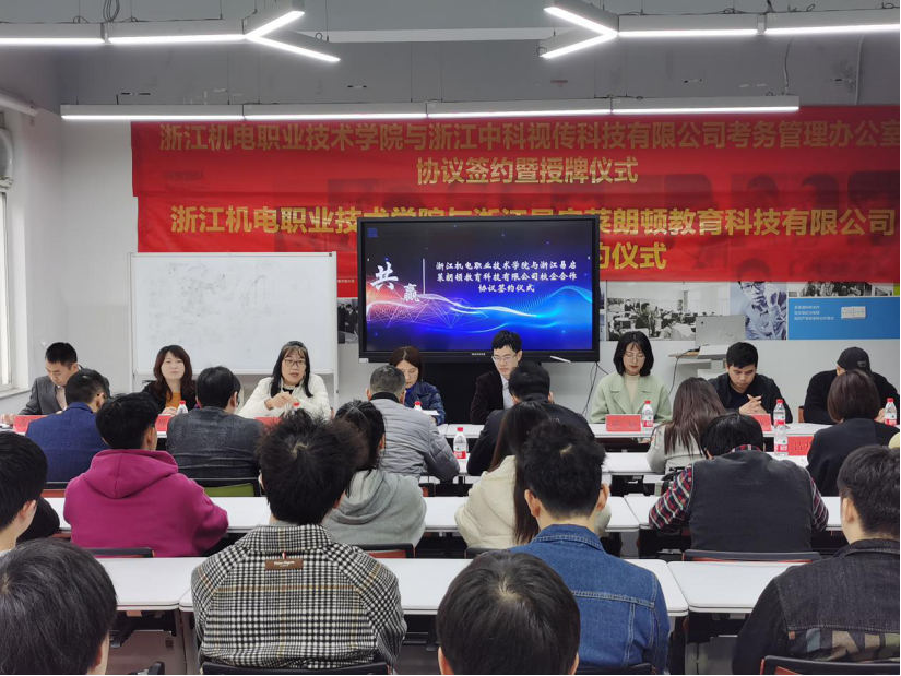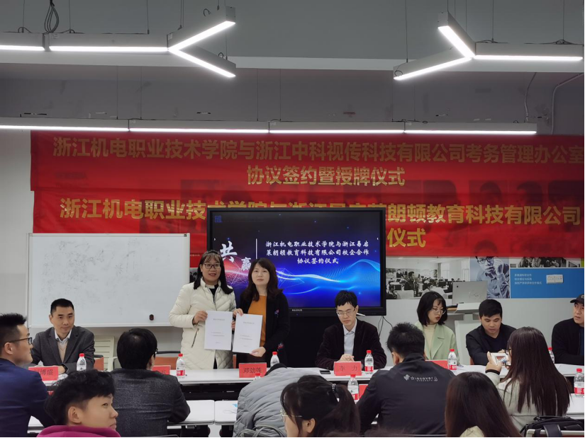 本次签约标志着浙江机电职业技术学院、浙江中科视传教育科技有限公司、浙江易启莱朗顿教育科技有限公司三方建立长期友好合作的开端,我校也将一如既往地为企业为社会培养复合型艺术类人才。