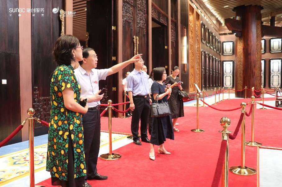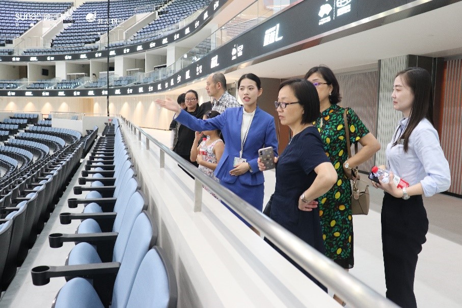 随后,国际教育学院一行在企业代表陪同下参观融创服务的杭州国际博览中心、杭州亚运会体育馆、游泳馆等。
