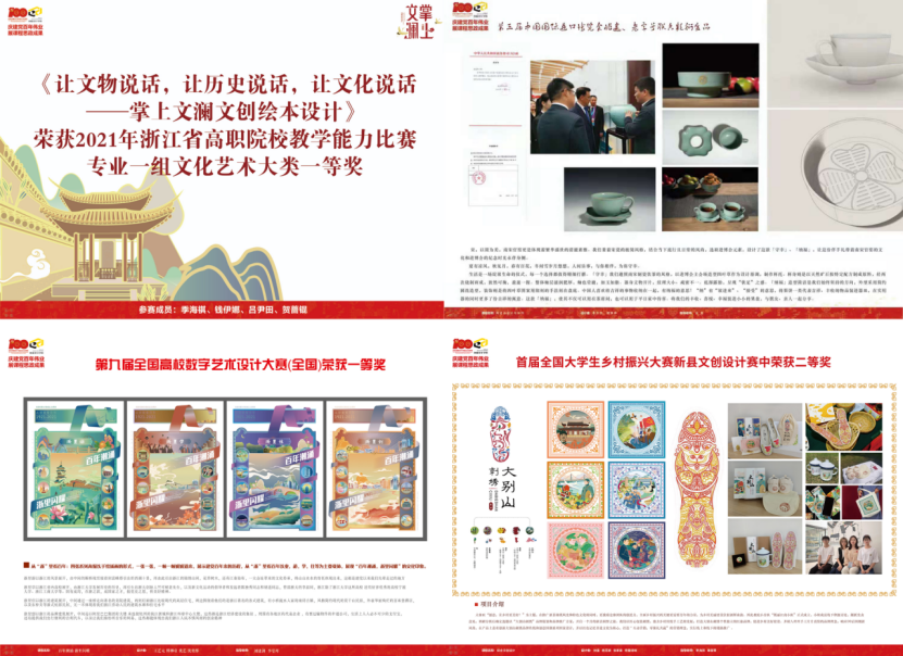 创意设计学院课程思政教学成果展共分红船从浙里起航、助力奥运展示科技魅力、乡村振兴展示多样成果等多个模块,展示了课程思政基于融入课堂教学、融入学生思想、融入学生比赛、融入真实项目等方面学生作品。