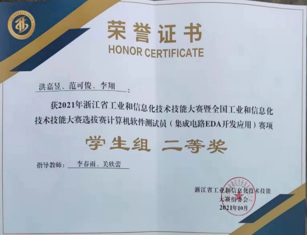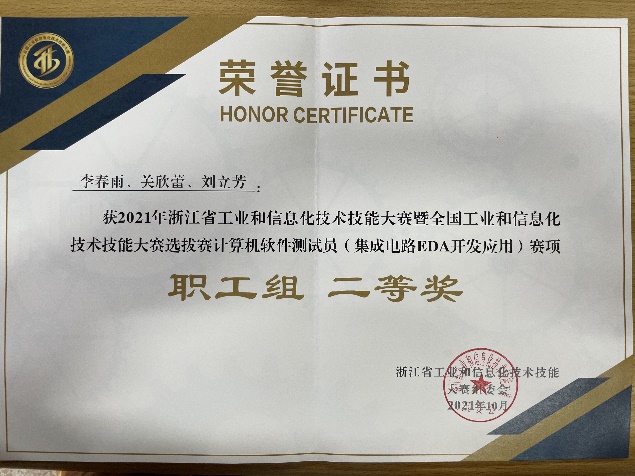 10月13日,2021年浙江省工业和信息化技术技能大赛暨全国工业和信息化技术技能大赛选拔赛在杭州科技职业技术学院闭幕,本次大赛由浙江省经济和信息化厅、浙江省人力资源和社会保障厅、浙江省教育厅、浙江省总工会、共青团浙江省委主办,我校自动化学院李春雨、关欣蕾、刘立芳三位老师荣获集成电路EDA开发应用赛项教职工组二等奖,电子2002班洪嘉昱、电子2003班范可骏、电子2001班李翔荣获集成电路EDA开发应用赛项学生组二等奖,并为我校赢得“团体总分奖”。