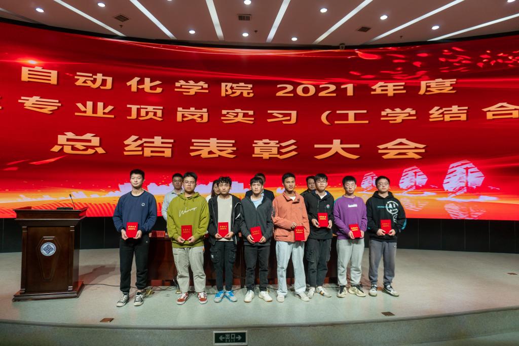 为表彰先进,树立典型,于施佳副书记宣读工学结合优秀学员名单,对郭佳宁等77名2021年度顶岗实习优秀学员进行表彰。自动化1892班朱浩嘉、机电1902班徐永健作为优秀学生代表上台分享自己顶岗实习的经历与收获。