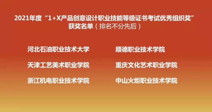 我校认真贯彻落实《国家职业教育改革实施方案》和《关于在院校实施“学历证书+若干职业技能等级证书”制度试点方案》的部署要求,2021年创意设计学院积极组织学生参加1+X证书考试,通过率100%;同时积极协办1+X产品创意设计职业技能等级证书线下教师队伍试点建设研修班,积极参与证书相关政策的解读和推广,并为来自全国13个省、自治区、直辖市23所本专科及中职学校的44位产品创意设计领域青年骨干、学科带头人、教研教务等一线教师,更好的理清1+X证书实施思路,为推动试点工作取得新的发展和成绩做出了自己的努力。