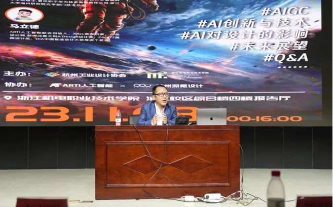 11月8日下午,浙江机电职业技术学院创意设计学院和杭州工业设计协会共同举办的《AI技术引领设计变革-探索未来设计》主题沙龙在综合楼4楼报告厅顺利举行。由ARTI人工智能联合创始人顾海鹏,深氪设计主理人李克军、资深AIGC设计师马立德作为主讲嘉宾进行分享,创意设计学院党总支副书记符强和学院200余名师生参加了活动。