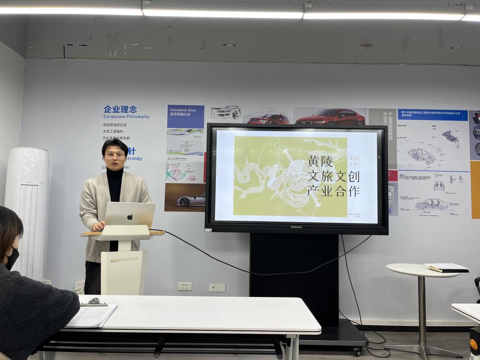 采风调研结束后,团队代表陆砚墨老师结合毕业设计课题重点,对本次采风的素材进行了收集与整理,向学院老师做了分享汇报,详细介绍了考察的具体内容、历史背景和当地文化特色。他介绍将以“基于史料,传于神话,研于文艺,祭于黄陵”作为创作思路,根据根脉文化脉络将产品体系分为:品牌IP设计、实物文创产品、剧本创作、数字内容与交互设计与短视频制作等五大类,以实物为载体,以毕业设计教学环节为契机,对中华根脉文化创意产品进行设计与研发。