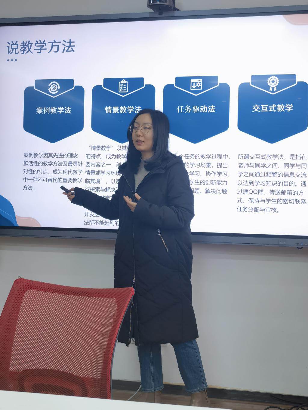 此次说课比赛由分院教学委员会委员和督导组成员担任评委。3名青年教师按照抽签顺序展示说课内容,从教材分析、学情分析、教学方法、教学过程、板书设计和教学反思等方面进行详细阐述。青年教师们精心制作课件,严谨认真,沉着参赛,大胆展示,展现了新生代教师的风采。