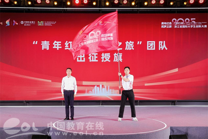现场,往届浙江省国际大学生创新大赛“红旅”赛道成果生动展现。发布“农行杯”浙江省国际大学生创新大赛(2025)的主题曲《青春不败》以及同名MV。为“青年红色筑梦之旅”团队出征授旗,并正式启动“青年红色筑梦之旅”活动。