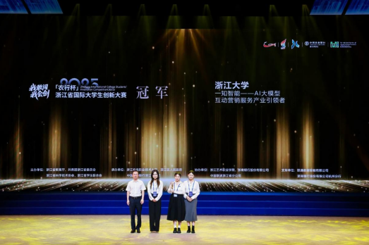 闭幕式上,来自浙江大学、宁波大学、浙江机电职业技术大学等学校的5支参赛队伍,从全省5.93万个项目中脱颖而出,站上了“农行杯”浙江省国际大学生创新大赛(2025)冠军争夺赛的舞台,向总冠军荣耀发起最后冲刺。经过项目团队陈述、评委提问、选手作答、导师推荐等环节,最终浙江大学“一知智能——AI大模型互动营销服务产业引领者”斩获大赛总冠军。