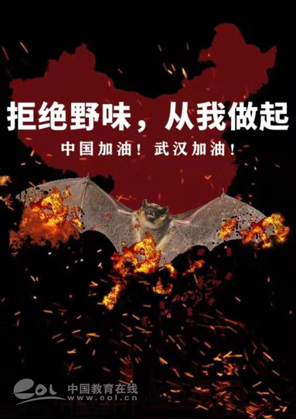 作品说明:因为食用野生动物,而导致新型冠状肺炎病毒肆虐,黑色笼罩在中国图案和城市插画上。“蝙蝠”是该病毒的寄主,因为病毒不可视,所以借用蝙蝠给它一个可视形状,金色火焰燃烧,一方面提醒人们要拒食野生动物,另一方面表示消灭病毒的决心。