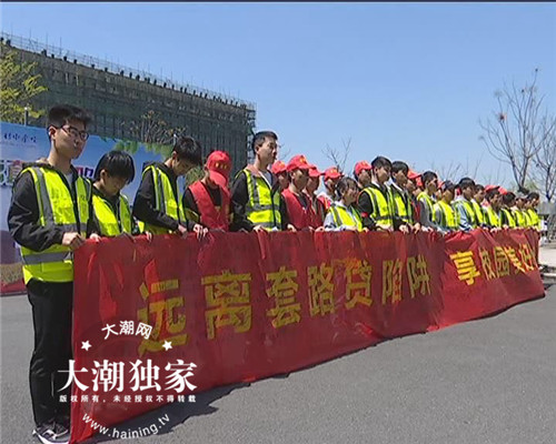 4月1日中午,在浙江机电职业技术学院长安校区南广场和食堂门口,海宁长安派出所联合机电学院开展了“远离套路贷陷阱、享校园美好生活”宣传活动。活动现场,志愿者分发宣传资料,广大学生在横幅上集体签名,长安派出所镇区警长陈力在向学生们讲解套路贷的陷阱。