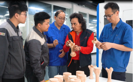在和设计团队无数次对接碰撞后,学校依托多轴精密数控加工技能工作室与新东阳木雕研创团队共同研讨技术难题、验证加工工艺。依托学校多轴精密数控加工中心的精雕五轴设备,进行0.1微米进给、1微米切削的纳米级精细加工,并将花器产品的制作融入五轴加工实训案例,实施“项目导向、任务驱动、讲解+演示+训练”实践教学模式,激发学生创新思维,同时融合多轴数控精密加工新理念、新技术、新模式,提高生产效率和加工质量,攻克花器的加工技术难题。