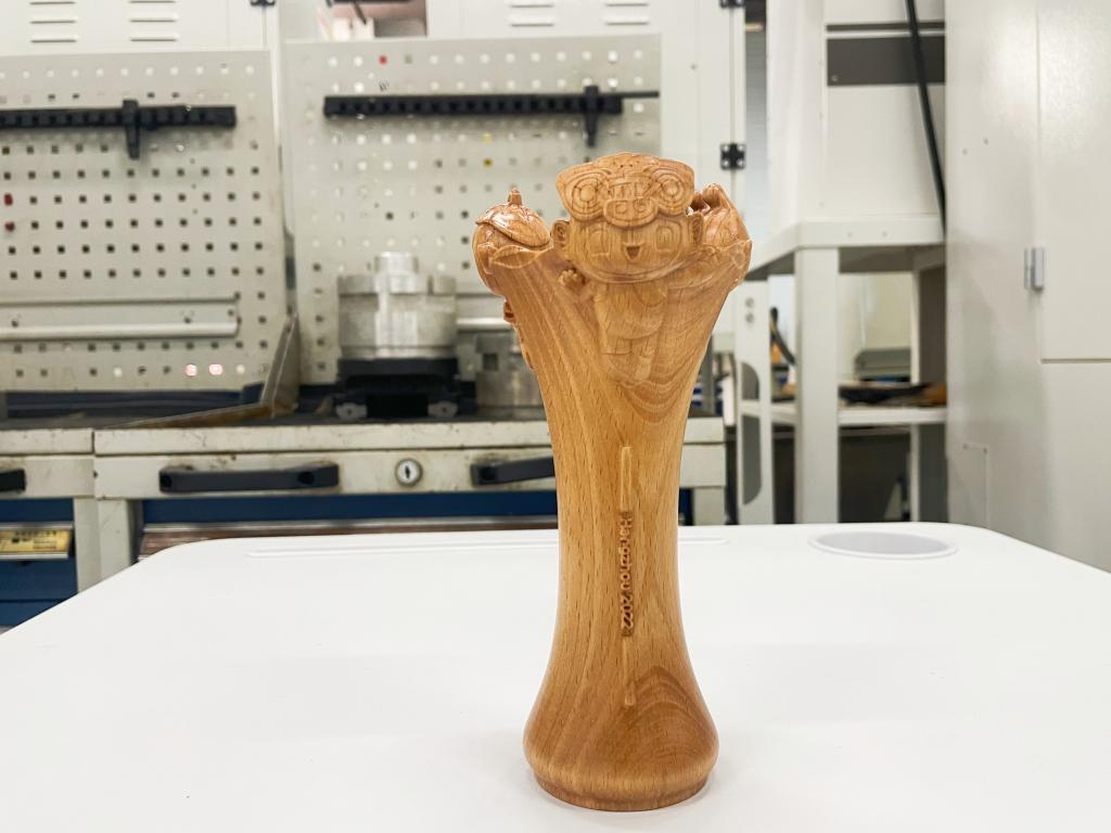 再仔细观察,颁奖花器表面还设计了稻穗、莲蓬、龙井茶枝等杭州元素。如此繁复的工艺是如何生产出来的?记者找到了此次负责部分生产制作花器工作的浙江机电职业技术学院(简称浙机电)智能制造学院党总支书记楼建忠。他告诉记者,光花器表面就要运用圆雕、高浮雕、浅浮雕等多种技法,在18厘米的榉木上进行精细雕刻才能完成,每一个细节都十分讲究。“具体到生产制作过程,需要利用五轴精密加工技术,涉及到刀具路径的设置、刀具选择、程序设计、机床夹具设计等。”看来,完成这项重大的任务,不是一件轻而易举的事。
