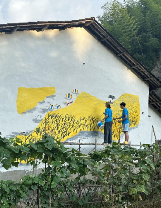 底色打稿、调配颜色、勾勒形状、绘图上色、添加层次、刻画细节……在沙坑村,同学们把当地村民对美好生活的理解融入墙绘创作中。大家分工明确,齐心协力,用近十天的时间累计完成9面墙绘。朱昱丞同学说:“我画的是丰收的稻田,丰收具有良好的寓意,能让人们产生幸福之感,同时代表村庄生机勃勃,人们幸福美满。”