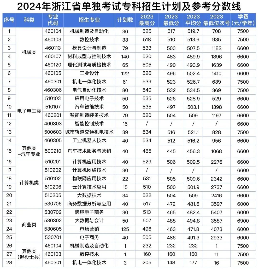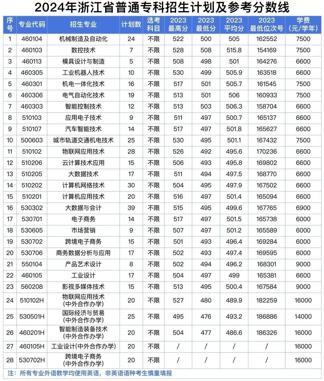 2.专科专业:2024年浙江省普通类一段线及以上考生,考入我校后,第一学期成绩合格并经本人申请,学院审核,可在第一学年第二学期在全校范围内任意转入所有专业。